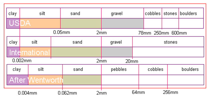 Soil texture is measured by the proportions of different sized particles making up the soil and classed as clay, silt and sand. There are several classifications as shown on the right.